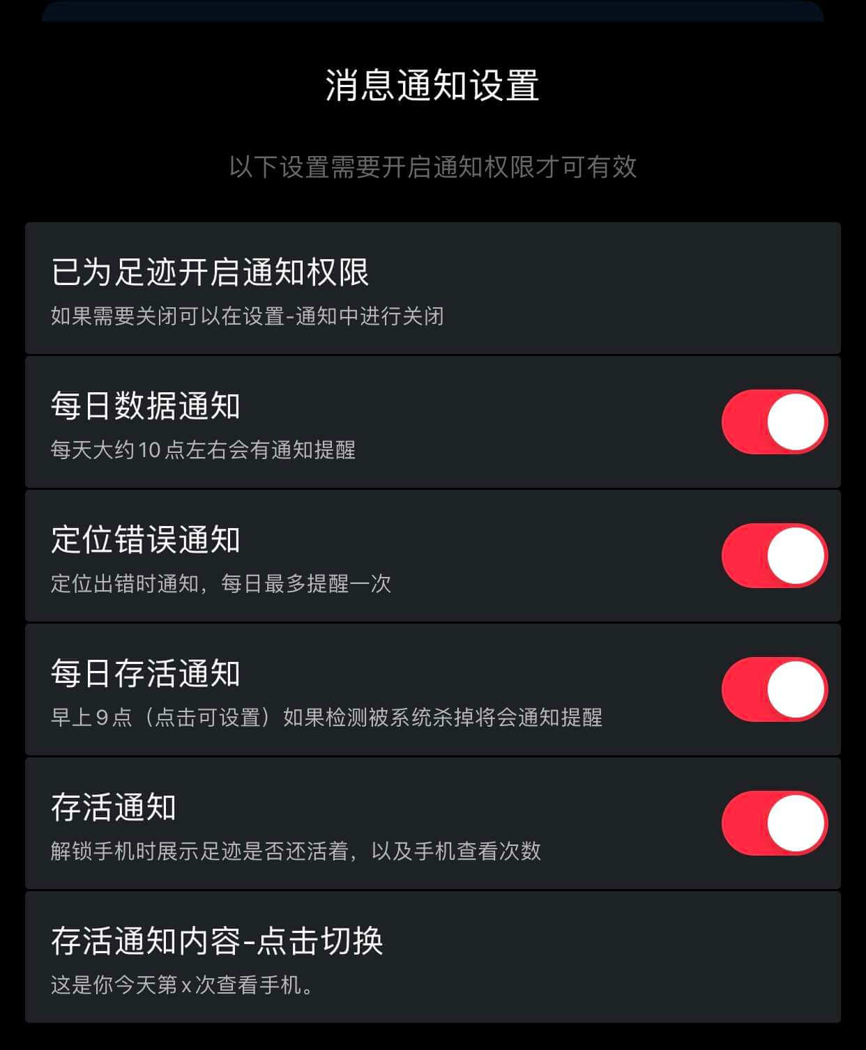- 打开每日存活通知:早上APP没有在后台运行会提醒你,防止夜间被系统杀掉导致第二天无法记录
